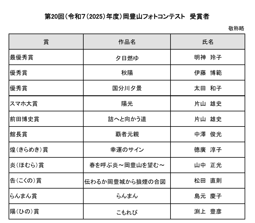 第20回(令和7(2025)年度)岡豊山フォトコンテストの審査を実施し受賞者が決定しましたので、お知らせいたします。