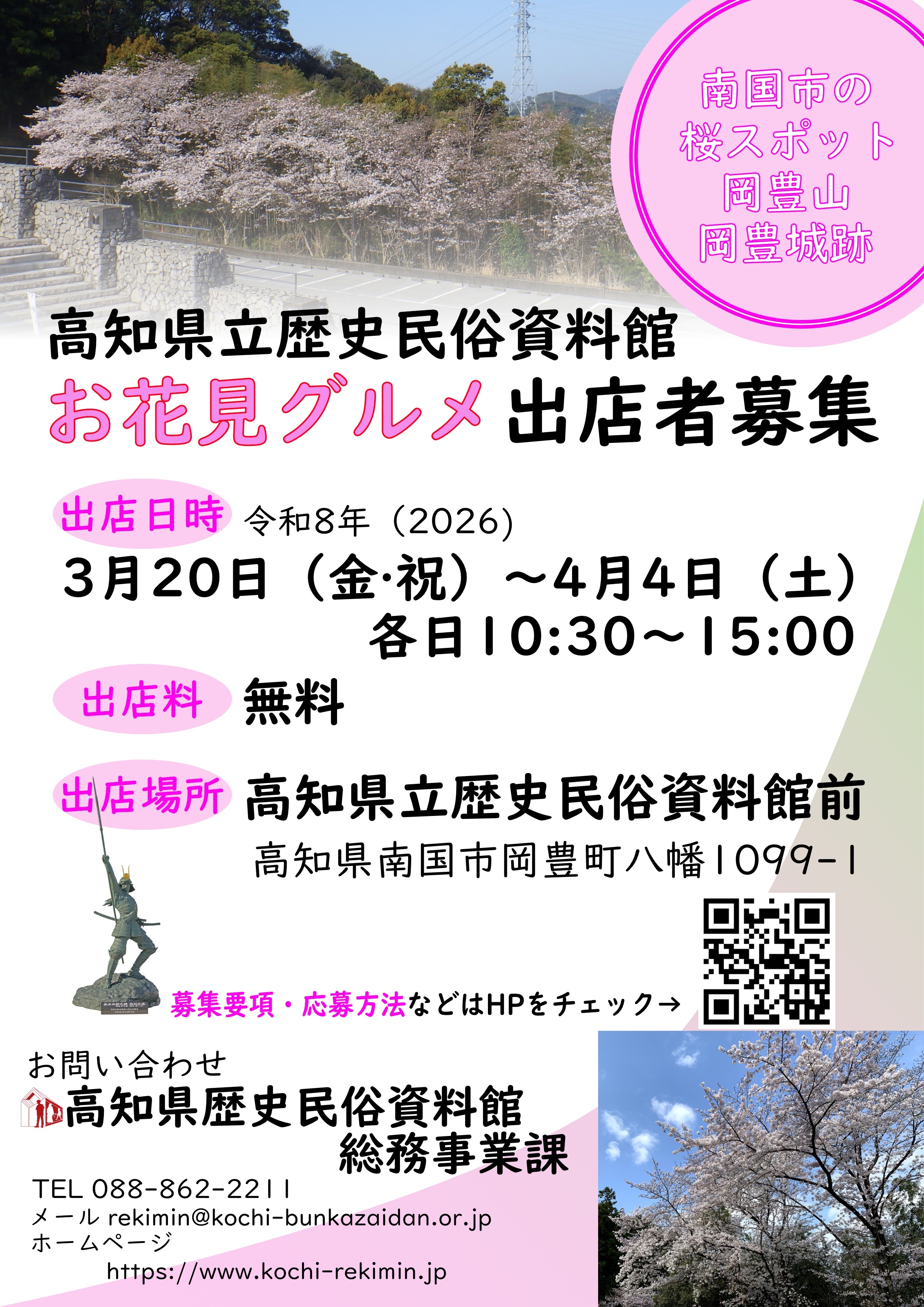 令和8年2月25日(水) 17時まで | 出店者募集 希望者は、FAX(088-862-2110)・Mail(rekimin@kochi-bunkazaidan.or.jp)・郵送または持参(〒783-0044 南国市岡豊町八幡1099-1 高知県立歴史民俗資料館)のいずれかの方法で応募してください。 |