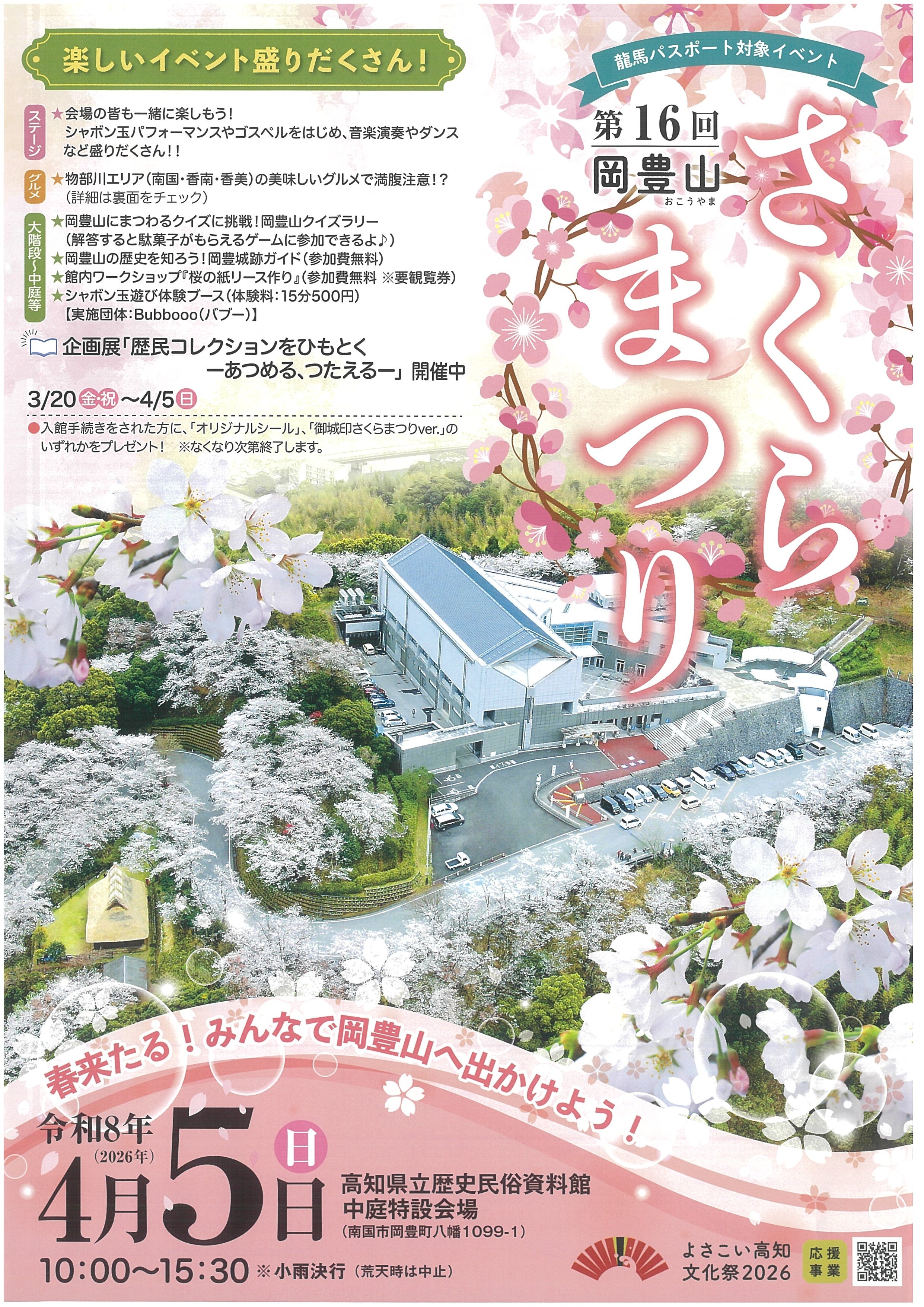 シャボン玉パフォーマンスやゴスペルの他、地元団体によるダンスや音楽演奏など多彩なプログラムをご用意しています。美味しいグルメブースも出店。館内ワークショップやクイズラリー、国史跡(くにしせき)・岡豊城跡(おこうじょうあと)の史跡ガイドツアーも体験することができます。